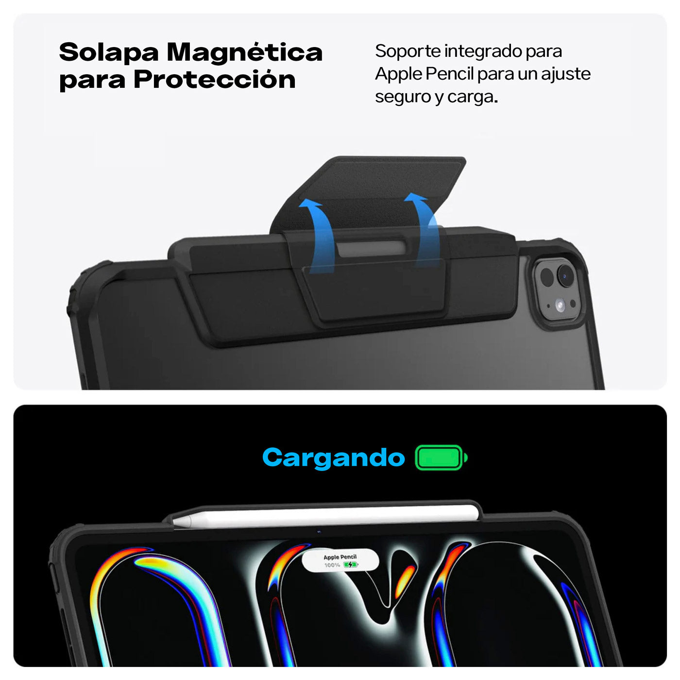 ¿Necesitas escribir, dibujar o improvisar una presentación? Su tapa frontal magnética se pliega convirtiéndose en soporte, mantiene tu Apple Pencil asegurado y se desmonta en un segundo, sin esfuerzo.