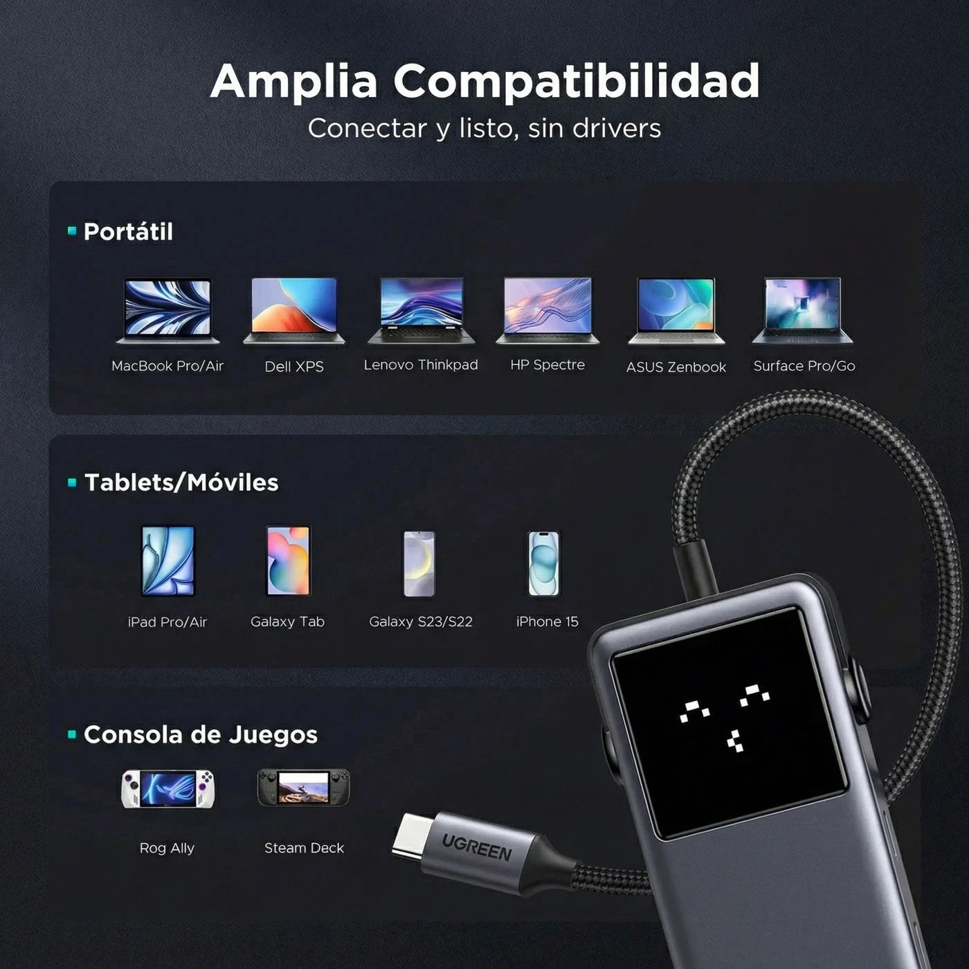 - Construcción sólida UGREEN: conexiones firmes y uso diario sin sustos.