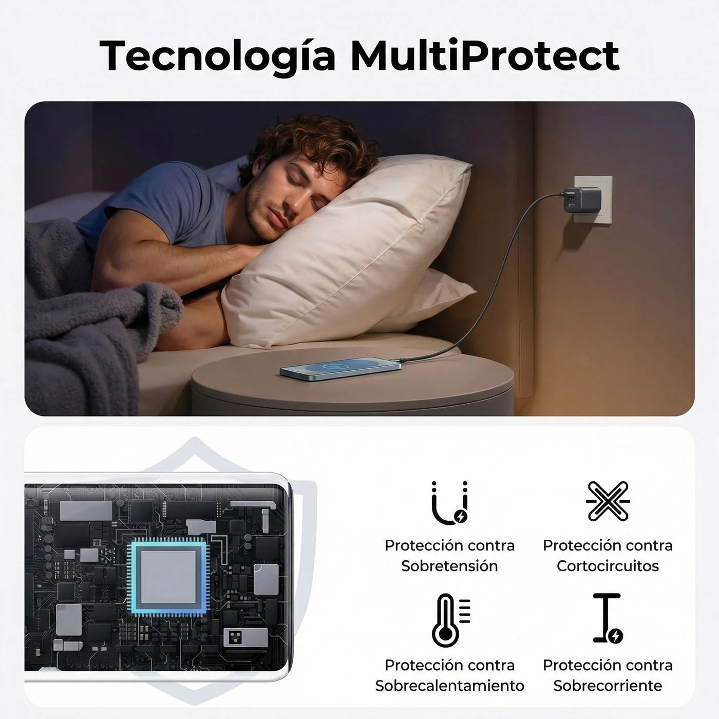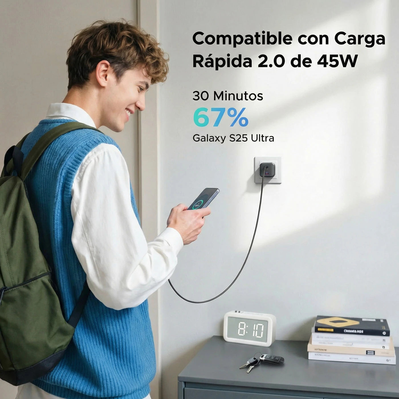 El UGREEN 45W GaN 3 USB-C (US 65155B) permite cargar múltiples equipos al mismo tiempo con distribución inteligente de energía. Tecnología GaN para mayor eficiencia y tamaño compacto. Ideal para escritorio minimalista o viajes sin llevar tres adaptadores.
