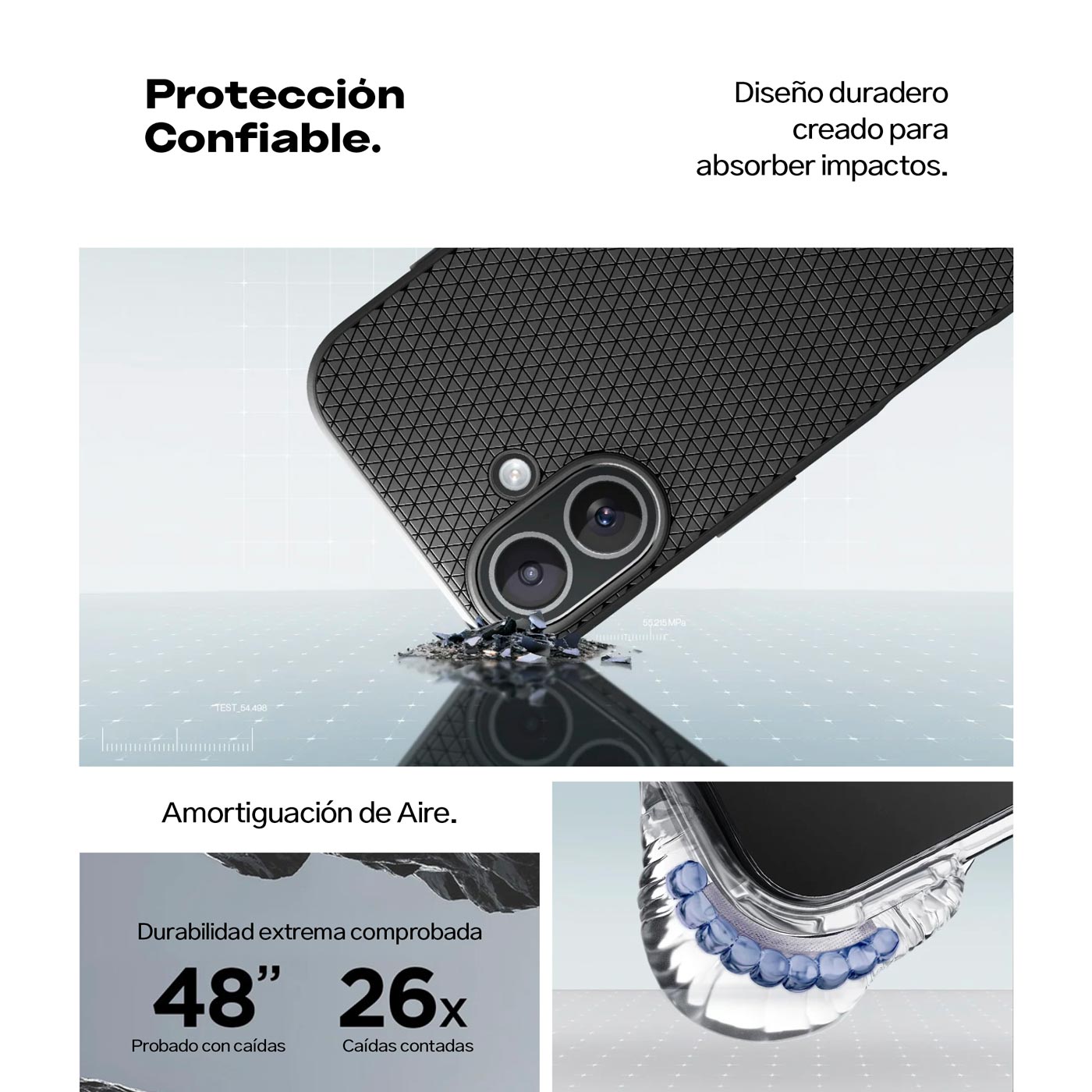 Tecnología AirCushion en las esquinas para proteger tu celular contra daños internos.