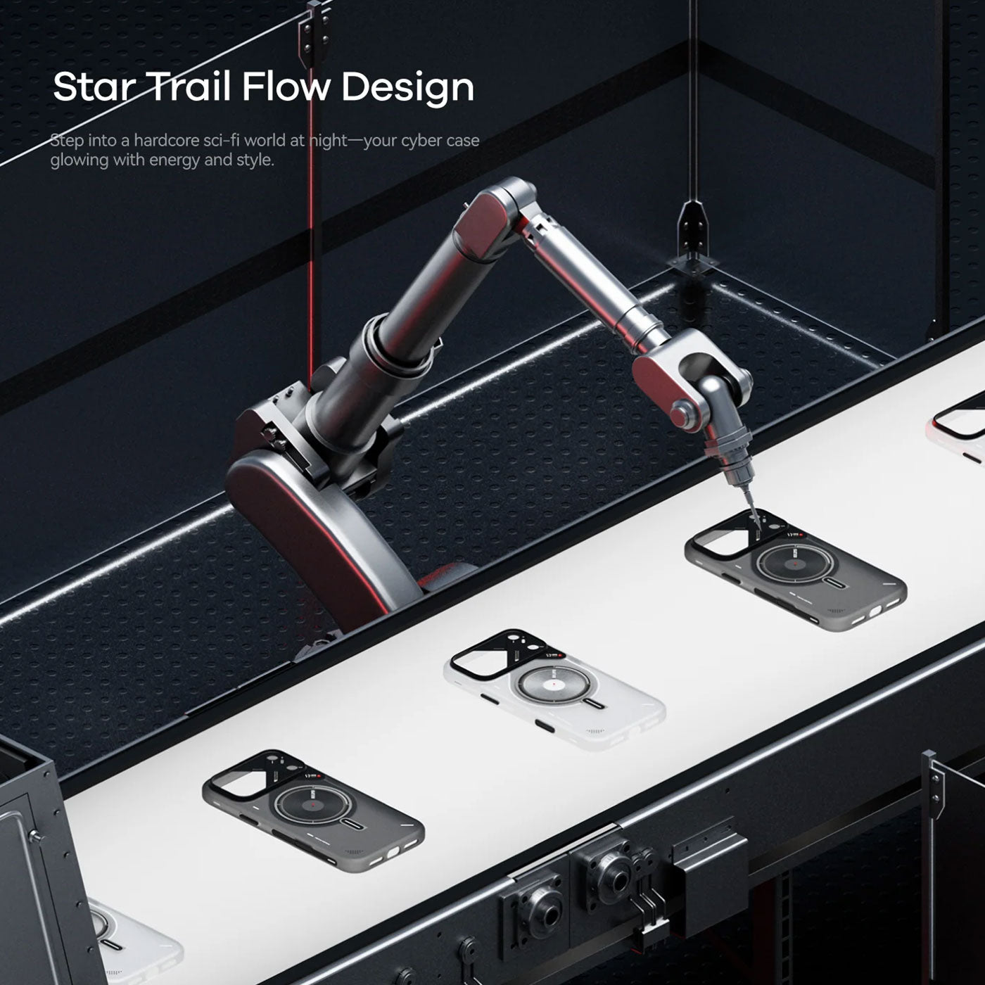 ¿Y lo mejor? Brilla en la oscuridad, con líneas luminosas sutiles, estilo sci-fi elegante, que se encienden como si tu teléfono tuviera alma propia.