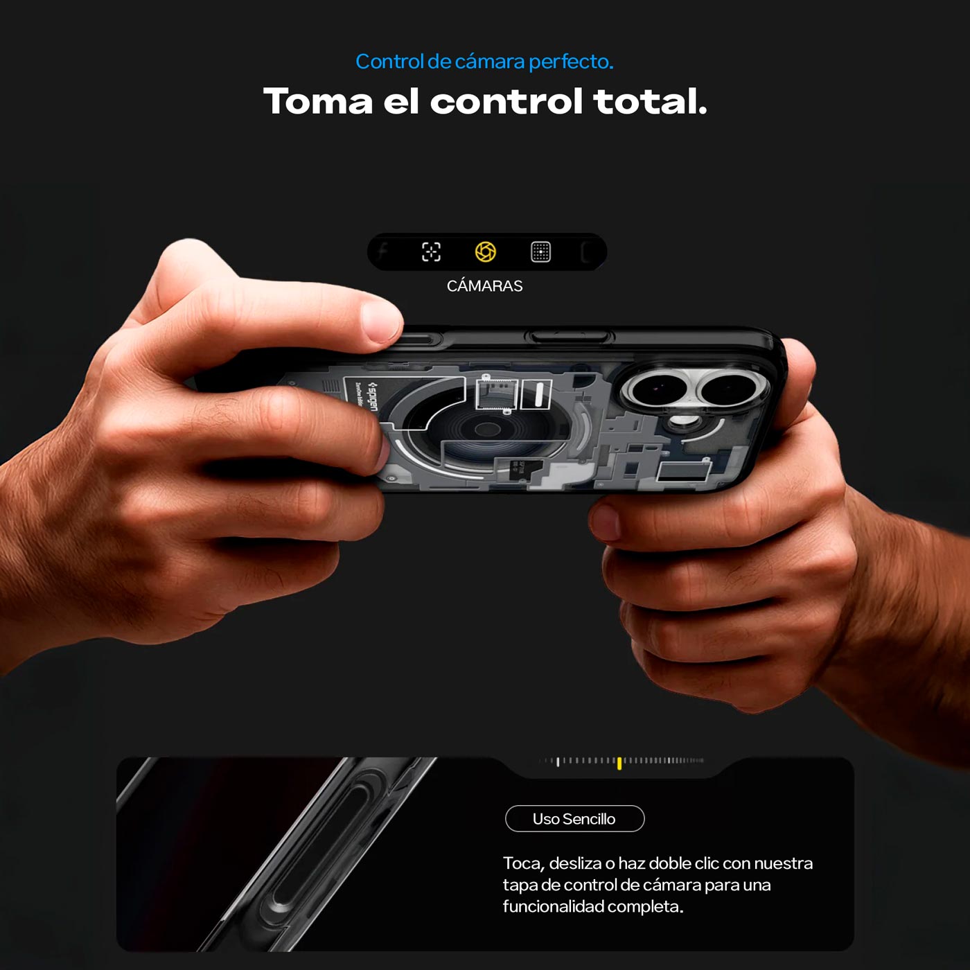 Este case viene con MagSafe integrado y camuflado, listo para conectarse con todos esos accesorios épicos que tienes en la mira (ver aquí). ¿Y el nuevo detalle? Una cubierta táctil sobre el botón de cámara que hace que tomar fotos se sienta más natural, más rápido, más tú.