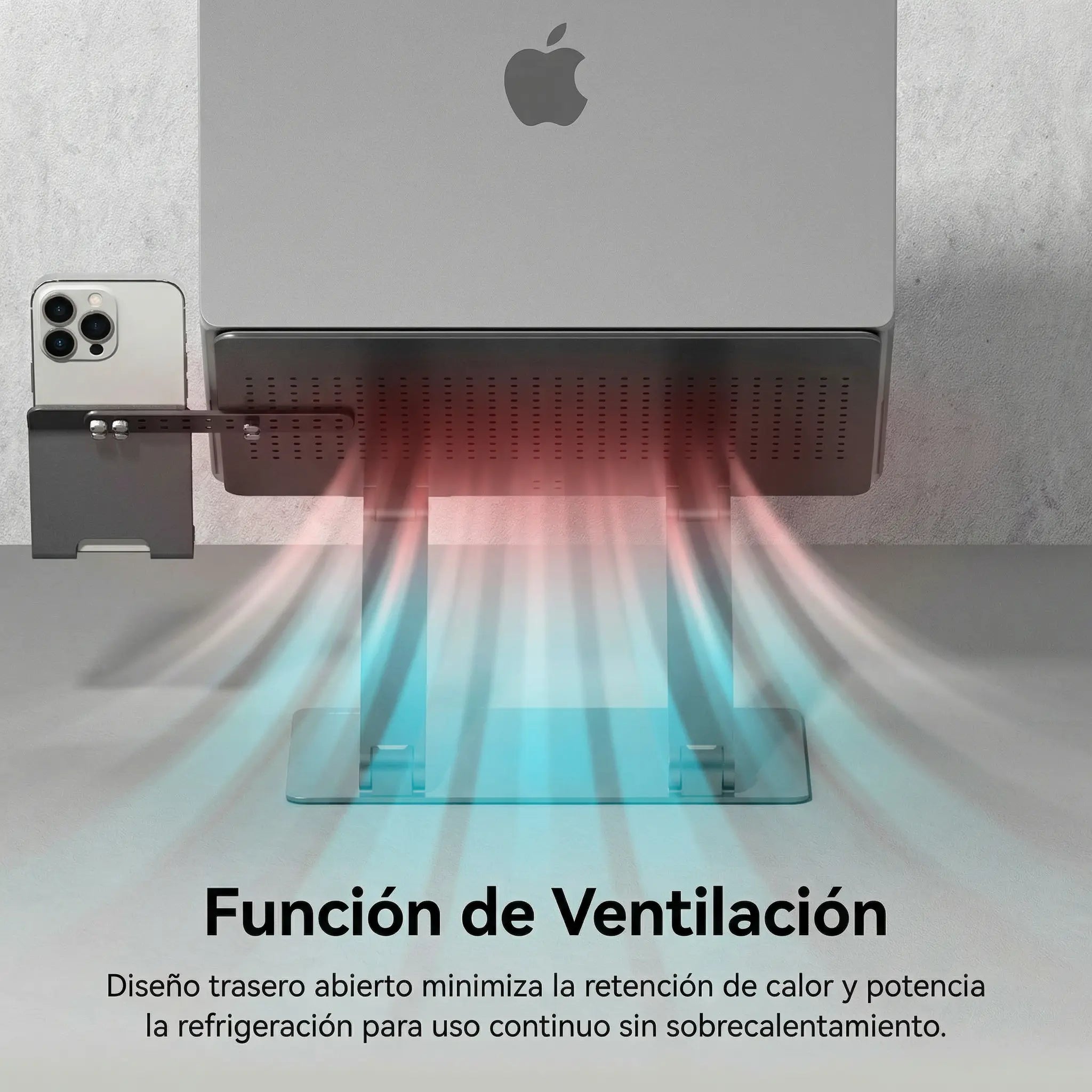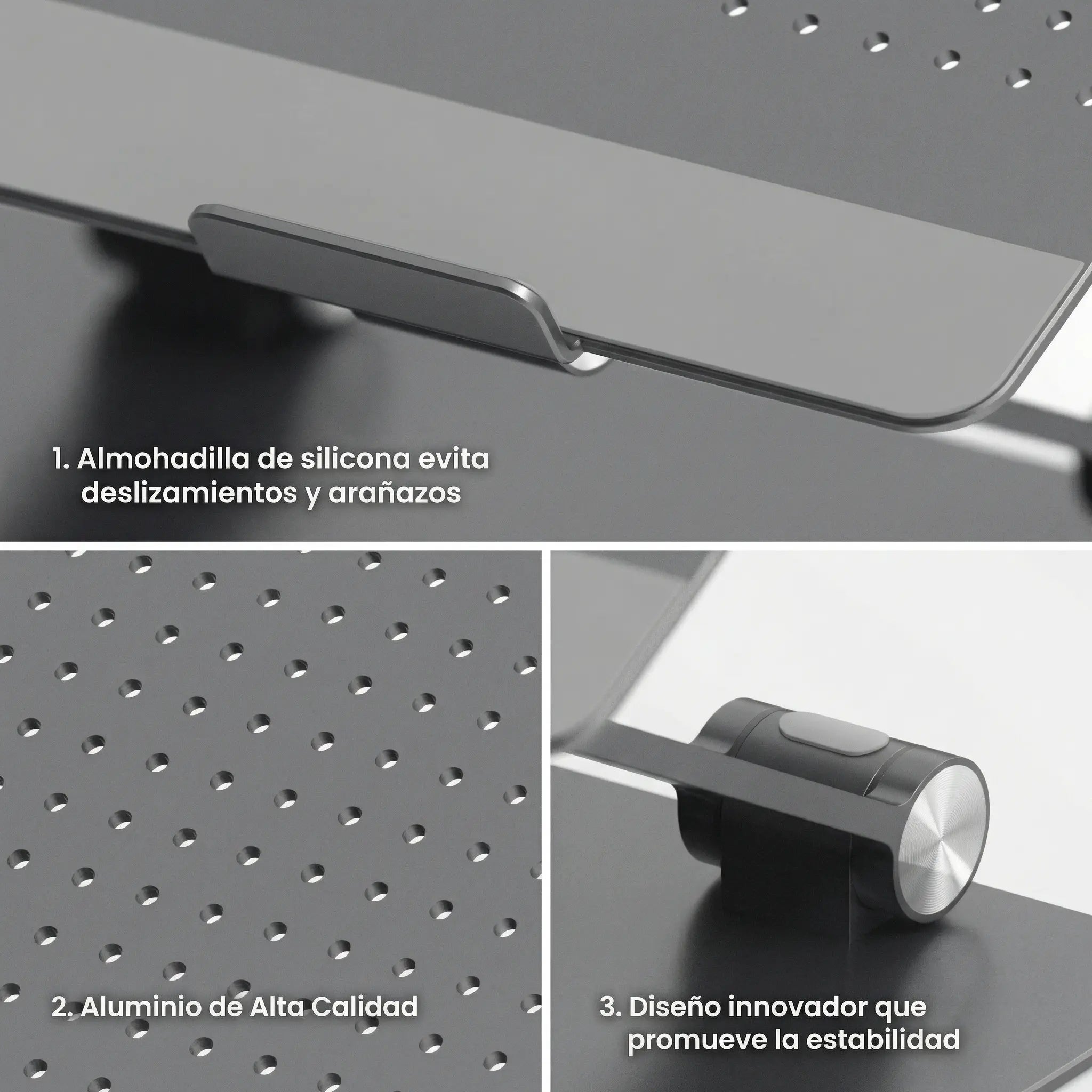 Stand fabricado con diseño minimal y aluminio de la más alta calidad para soportar el uso continuo y proporcionar un equilibrio estable.
